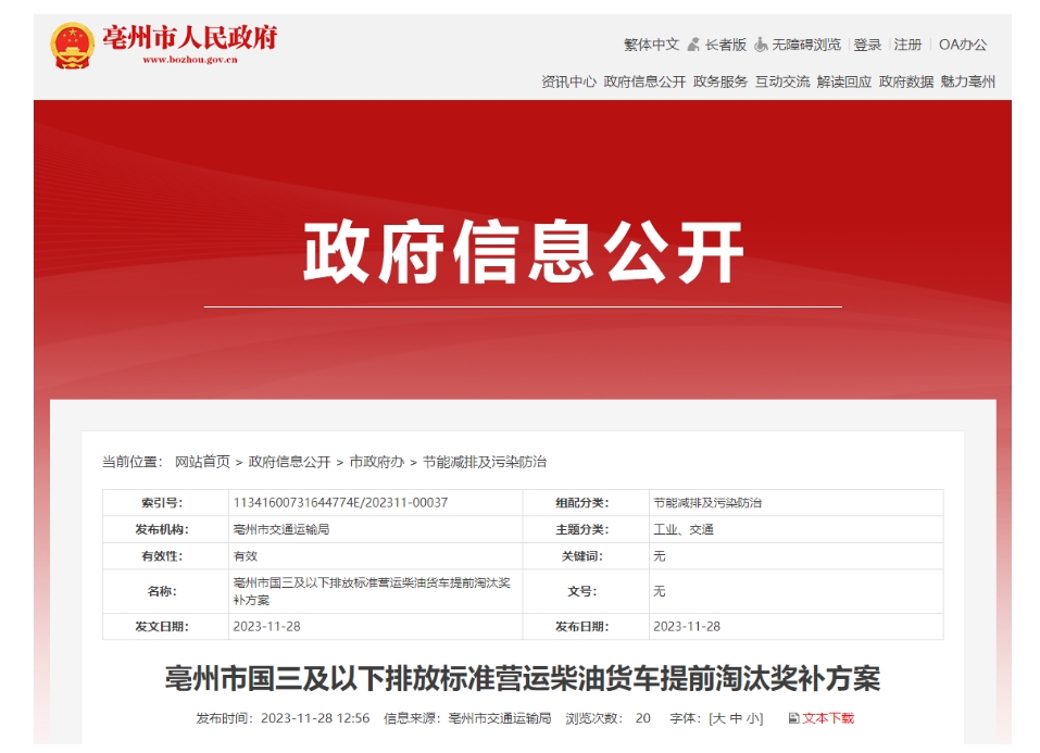 安徽省亳州市國三及以下排放標(biāo)準(zhǔn)營運柴油貨車提前淘汰獎補(bǔ)方案