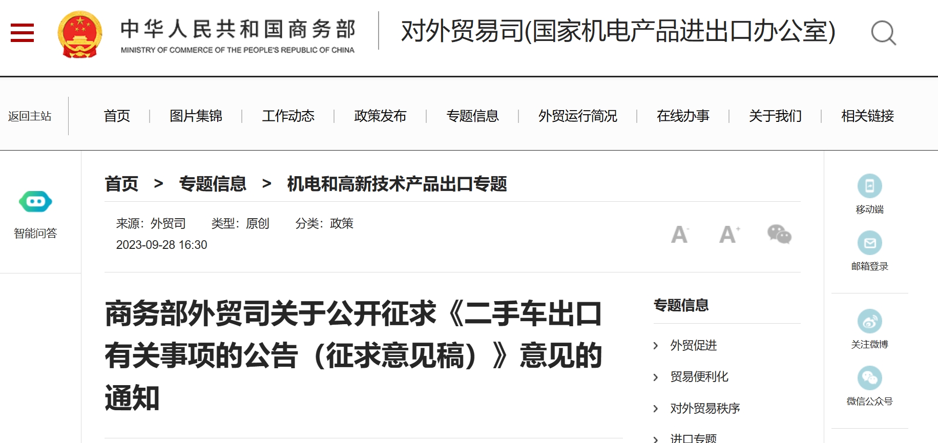 商務(wù)部外貿(mào)司關(guān)于公開征求《二手車出口有關(guān)事項的公告(征求意見稿)》意見的通知