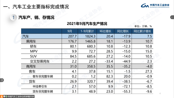 9月,汽車產(chǎn)銷分別達(dá)到207.7萬輛和206.7萬輛,環(huán)比增長20.4%和14.9%,同比下降17.9%和19.6%。