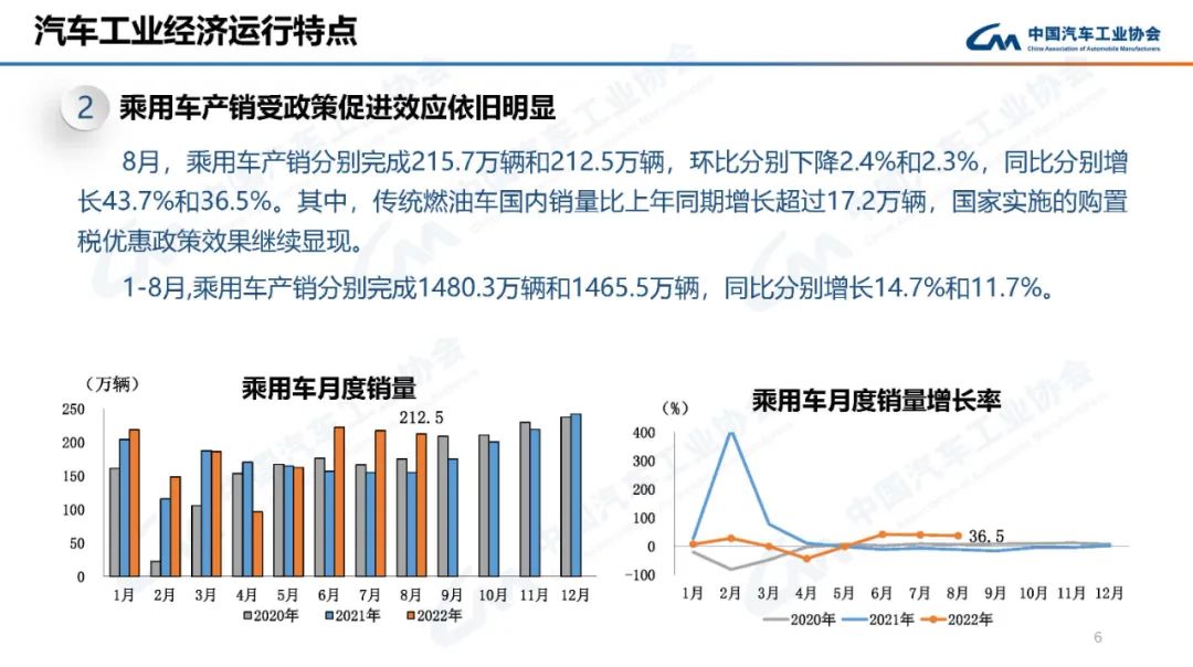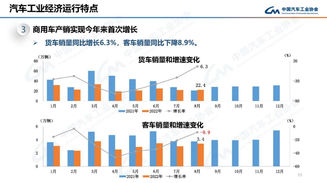 2022年8月,汽車產(chǎn)銷同比延續(xù)保持快速增長(zhǎng)勢(shì)頭,購(gòu)置稅優(yōu)惠等促消費(fèi)政策持續(xù)發(fā)力,乘用車消費(fèi)企穩(wěn)上升,即使經(jīng)濟(jì)運(yùn)行有波動(dòng),消費(fèi)依然堅(jiān)韌,已逐步恢復(fù)到正常狀態(tài);商用車產(chǎn)銷實(shí)現(xiàn)今年以來首次同比增長(zhǎng);本月新能源汽車產(chǎn)銷、汽車出口同比均創(chuàng)歷史新高。